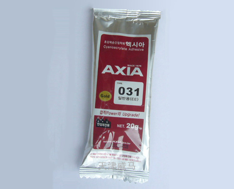造業深受歡迎,031型號在低黏度(3cps)的AXIA產品中是普通型(常用)的瞬間接著劑,能迅速滲透到各種金屬,橡膠,塑料,石材,陶瓷,玻璃,首飾,皮革等的表面層并發揮出迅速的粘接力。另在韓國汽車制造業,電子產品,手機部件等行業的廠家也深受歡迎。